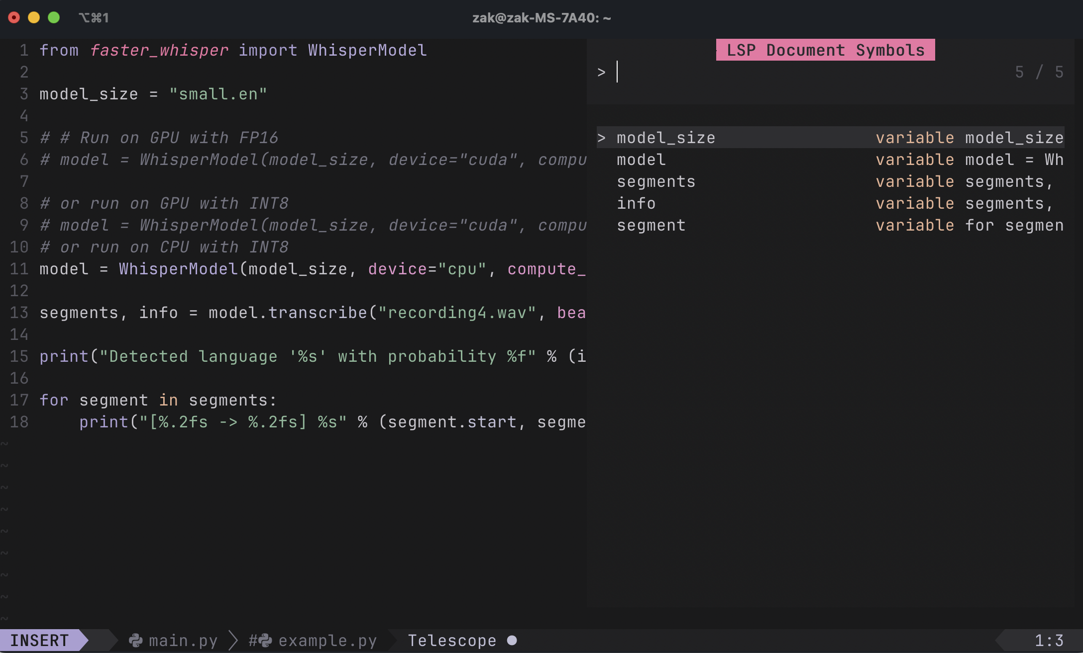 Have you seen those beautiful status lines by NvChad, LunarVim? I feel they sometimes are a bit over the top, like having a git branch, file type, etc. I usually know which branch I’m working on and don’t need a reminder of what PL I should be writing. Instead of having this extra bells and whistles I opted to show open buffers as a way to simulate tabs. I also bound <TAB>/<S-TAB> to cycle between them in normal mode.
